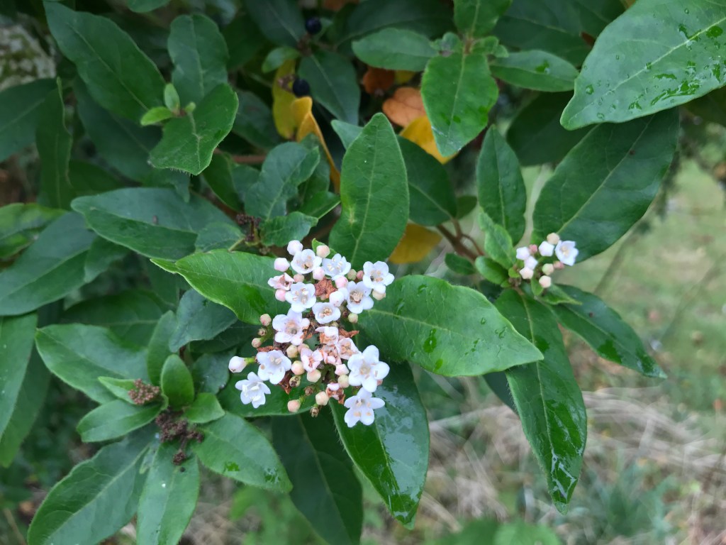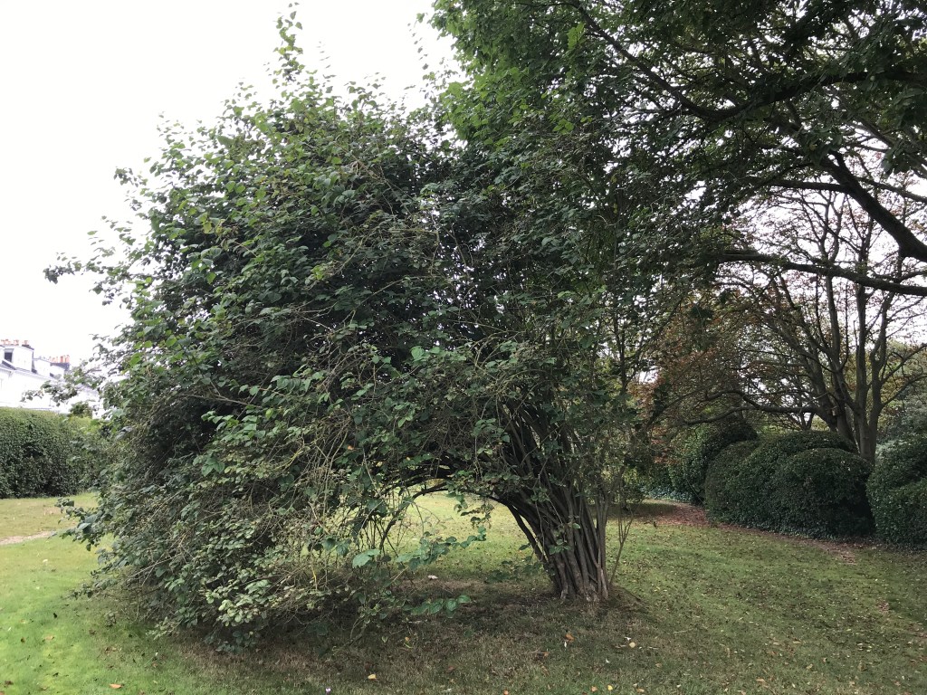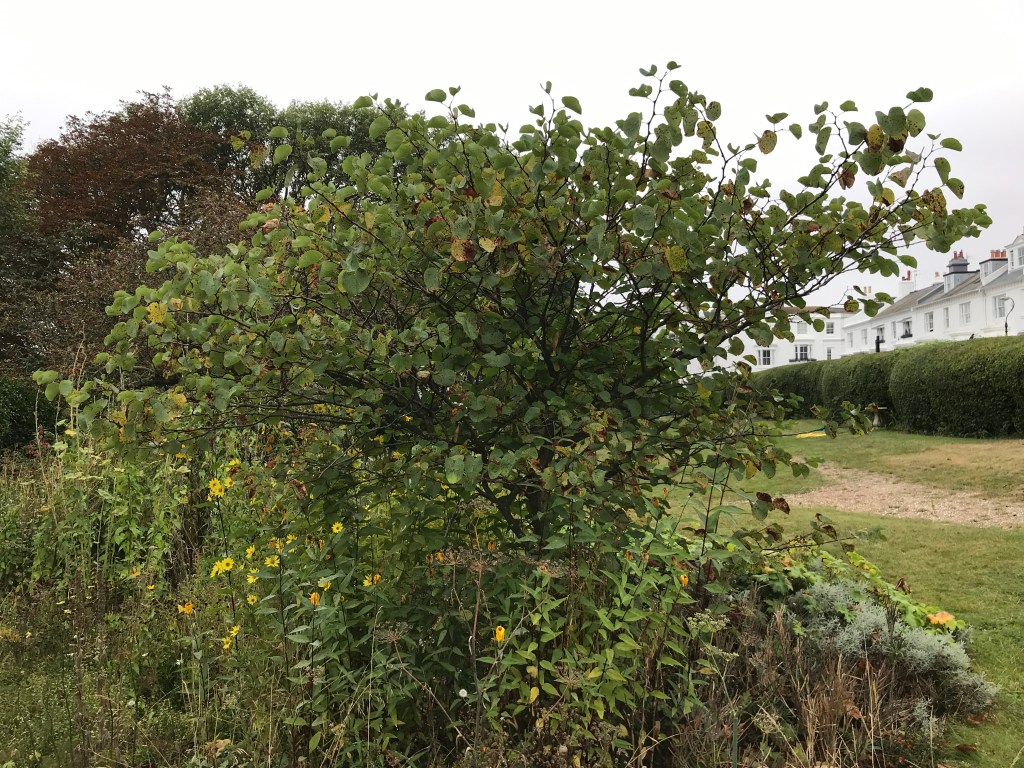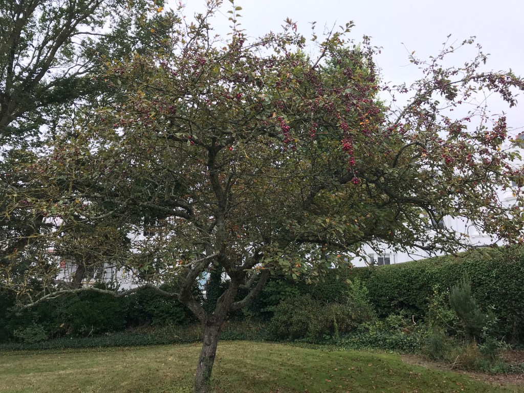 Same five trees, same two flower beds. No-one seems able to identify the rather weird fifth tree. It produces its flowers (first picture, below) in late September and keeps them all winter and right through the spring. Any ideas?