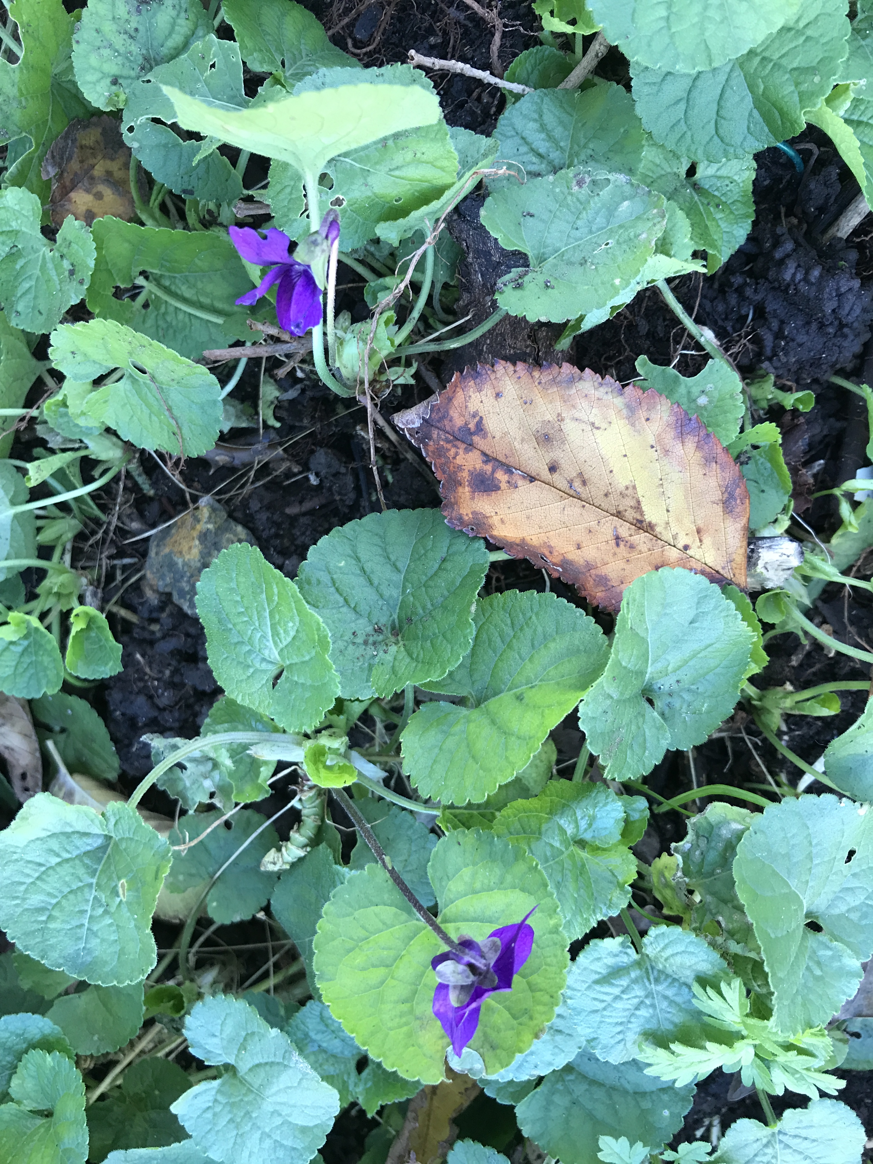 Upside 2: VIOLETS flowering among the autumn leaves at the end of November. This may not actually be great news – the seasons are all over the place.