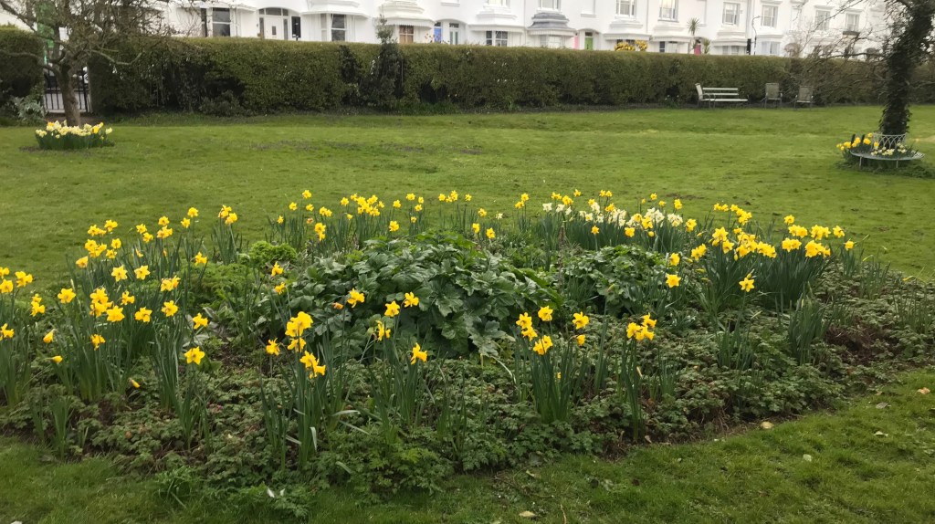 Bit odd to be thinking about next spring in the middle of this endless, grey November rain – but it’s now or never. I have a window tomorrow in which to finish planting over 500 daffodils, and I must get it done, whatever the weather! The bed above is the one I adopted in memory of my daughter – originally just for one year, but it seems wrong to stop now. The centre was planted with dozens of bright red tulips, which flowered a couple of weeks later. They did look good, but quite a lot of them got overgrown or dug up by birds and squirrels. I thought I would try something different this time, so tomorrow I have 101 (I know, weird number) aliums to add inside the daffodil planting. I have grubbed up most of those shrubby things (apparently called ‘bear’s breeches’) but I’ve left the little purple crane’s bill geraniums which flower after the bulbs.