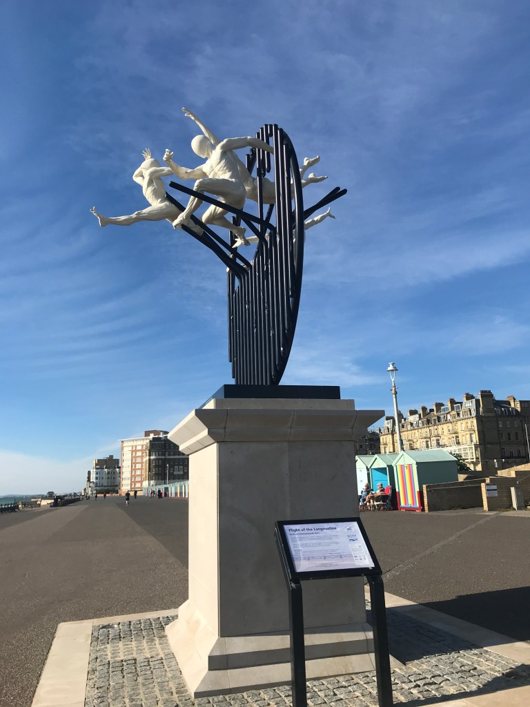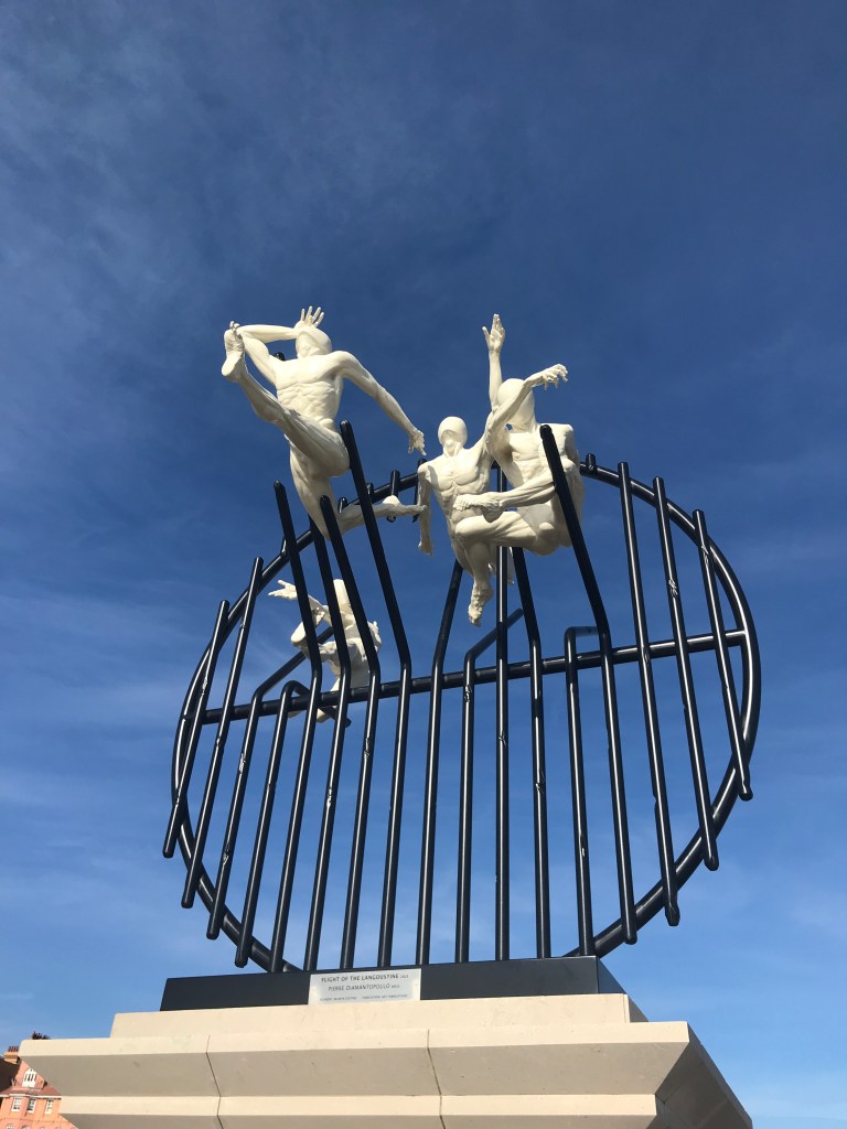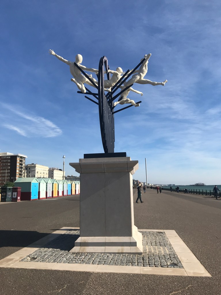 Not needed for work today, so had a quick look at the sea (Hove end), then back to sorting stuff for Etsy. These pictures were actually taken in mid October, hence the startlingly blue skies (and lack of pebbles – which are all over the place today.) The statue is relatively new. It’s called ‘Flight of the Langoustine’, by a Brighton sculptor Pierre Diamantopoulo and has only been on the Hove plinth for a month or so. I love the energy of the thing – life size human figures, escaping into the air through a metal grid. It was apparently inspired by a discarded lobster pot.
