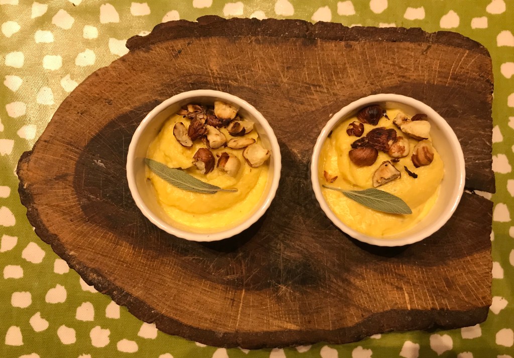 And then I decided to try and recreate the ‘plat d’attente’ from the rather upmarket restaurant we ate in in Troyes. It was a delicate little pumpkin cream pot, which came with a few other tasty bites to wake up your appetite before the first course. (I always appreciate these touches – in fact the main course is consistently my least favourite part – I’m definitely a tapas natural.)